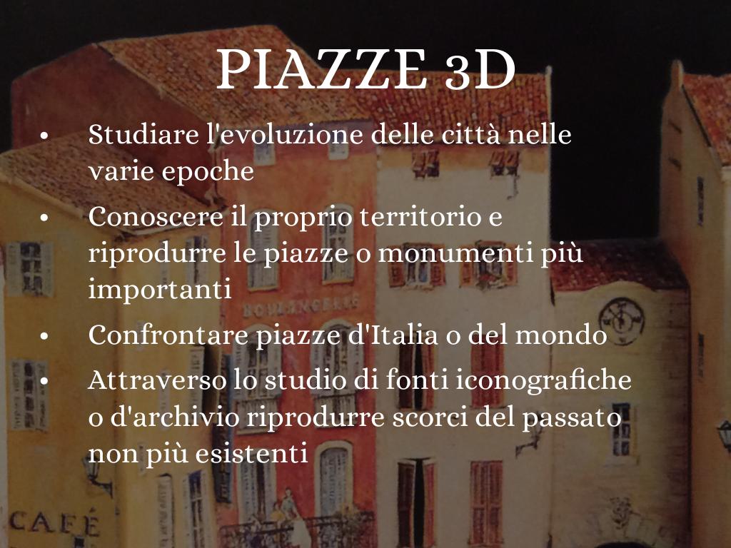 - Conoscere il proprio territorio e riprodurre le piazze o monumenti più importanti