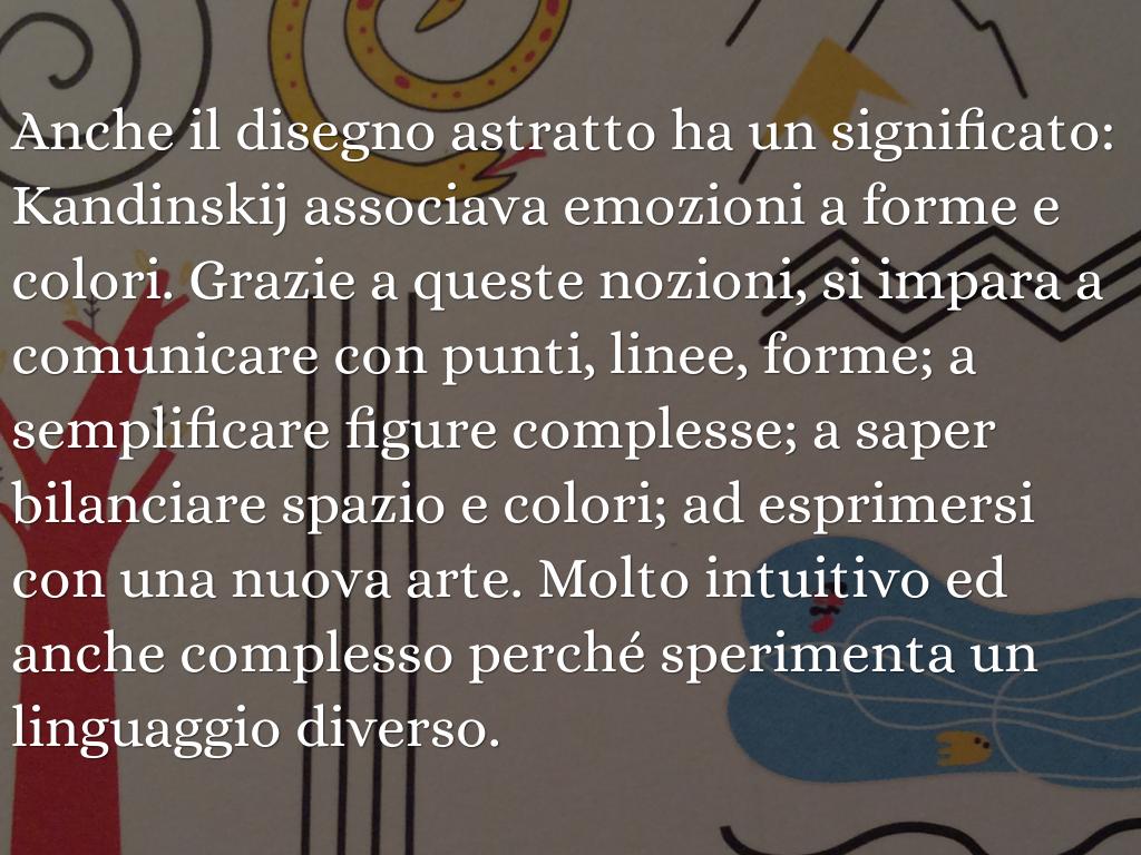 Anche il disegno astratto ha un significato: Kandinskij associava emozioni a forme e colori. Grazie a queste nozioni, si impara a comunicare con punti, linee, forme; a semplificare figure complesse; a saper bilanciare spazio e colori; ad esprimersi con una nuova arte. Molto intuitivo ed anche complesso perché sperimenta un linguaggio diverso.