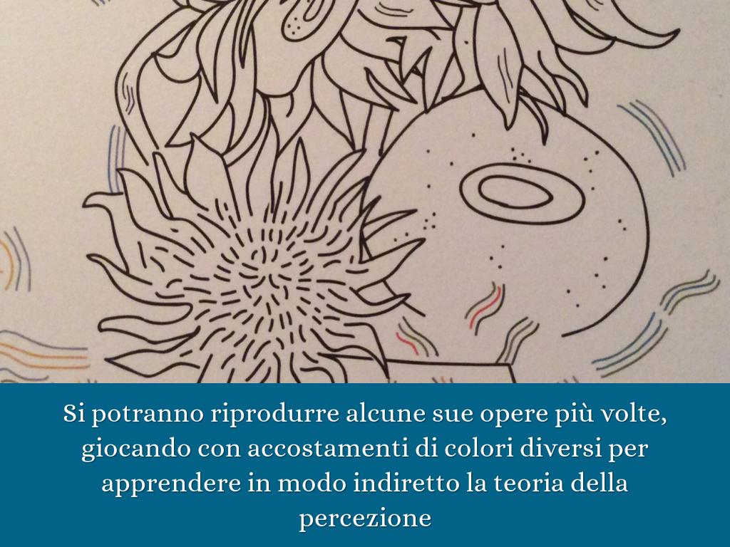 Si potranno riprodurre alcune sue opere più volte, giocando con accostamenti di colori diversi per apprendere in modo indiretto la teoria della percezione