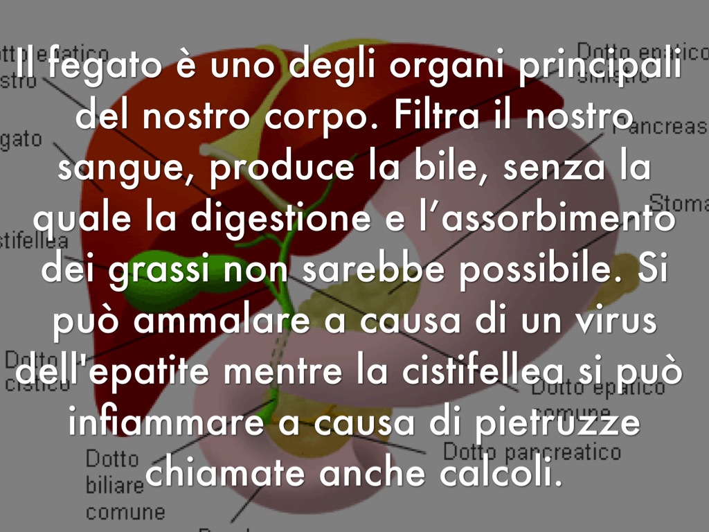 Il fegato è uno degli organi principali del nostro corpo. Filtra il nostro sangue, produce la bile, senza la quale la digestione e l’assorbimento dei grassi non sarebbe possibile. Si può ammalare a causa di un virus dell'epatite mentre la cistifellea si può infiammare a causa di pietruzze chiamate anche calcoli.