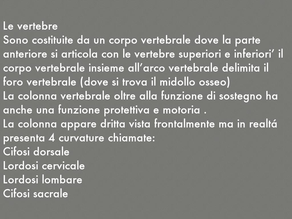 Sono costituite da un corpo vertebrale dove la parte anteriore si articola con le vertebre superiori e inferiori’ il corpo vertebrale insieme all’arco vertebrale delimita il foro vertebrale (dove si trova il midollo osseo)