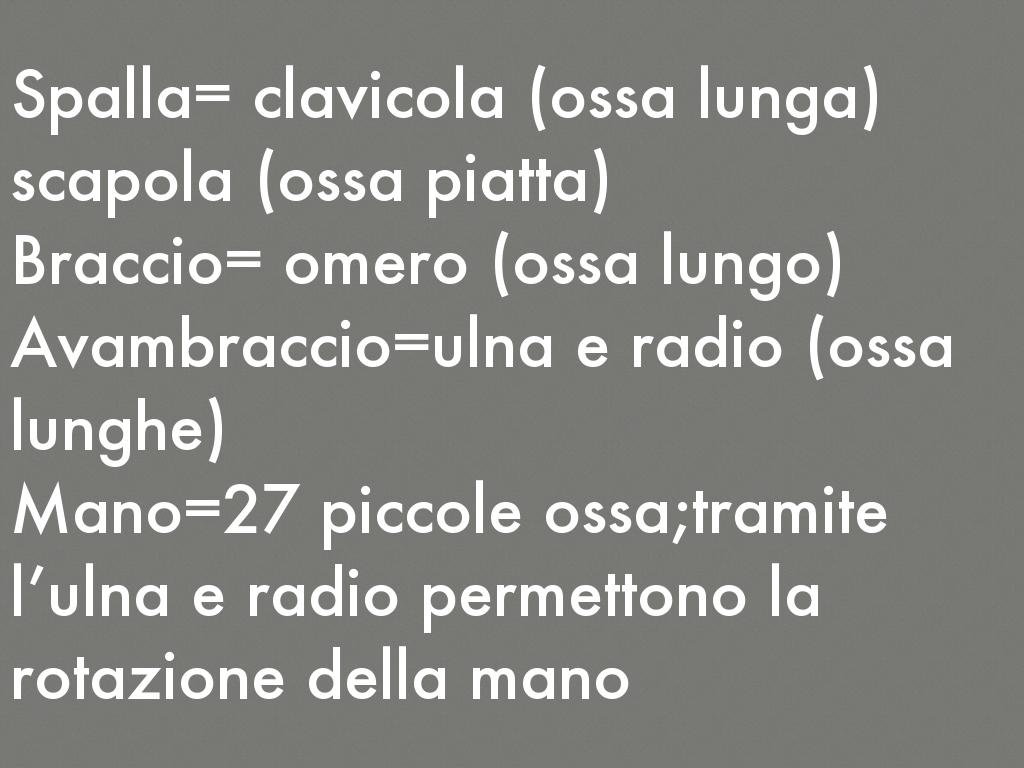 Mano=27 piccole ossa;tramite l’ulna e radio permettono la rotazione della mano