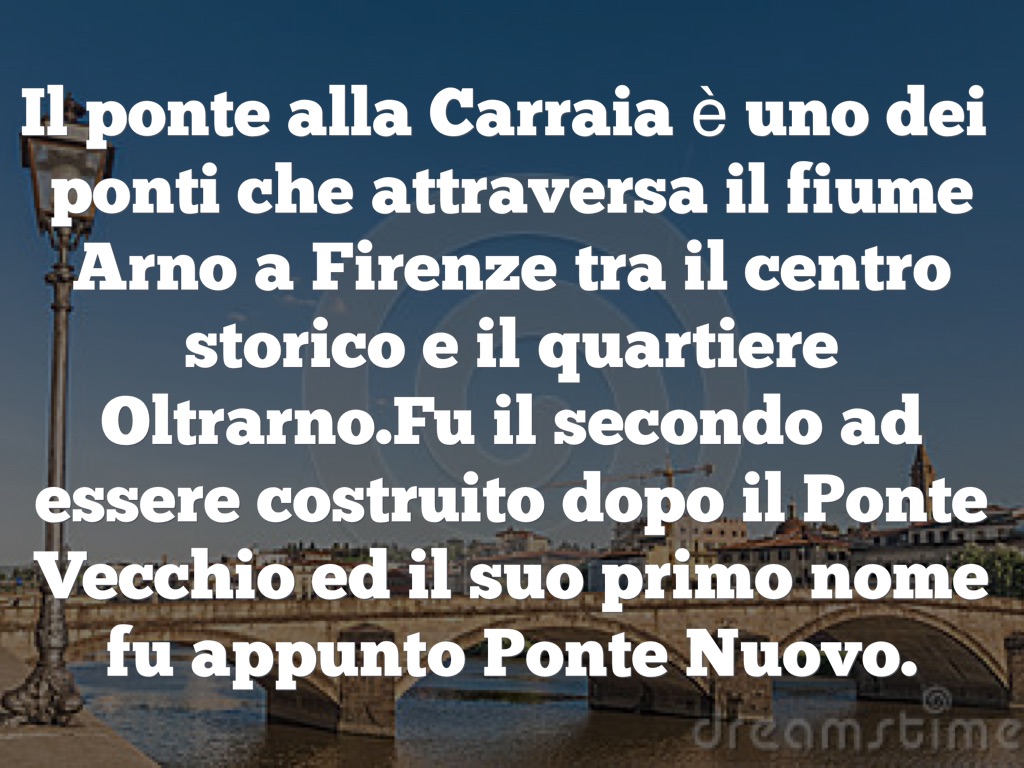 Il ponte alla Carraia è uno dei ponti che attraversa il fiume Arno a Firenze tra il centro storico e il quartiere Oltrarno.Fu il secondo ad essere costruito dopo il Ponte Vecchio ed il suo primo nome fu appunto Ponte Nuovo.
