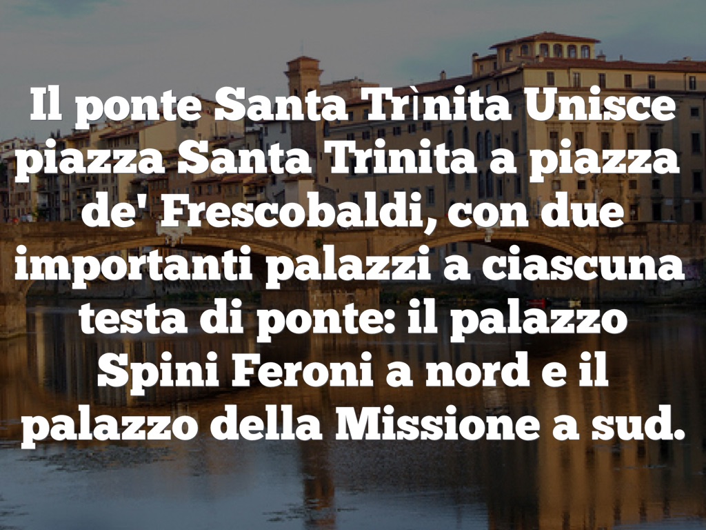 Il ponte Santa Trìnita Unisce piazza Santa Trinita a piazza de' Frescobaldi, con due importanti palazzi a ciascuna testa di ponte: il palazzo Spini Feroni a nord e il palazzo della Missione a sud.