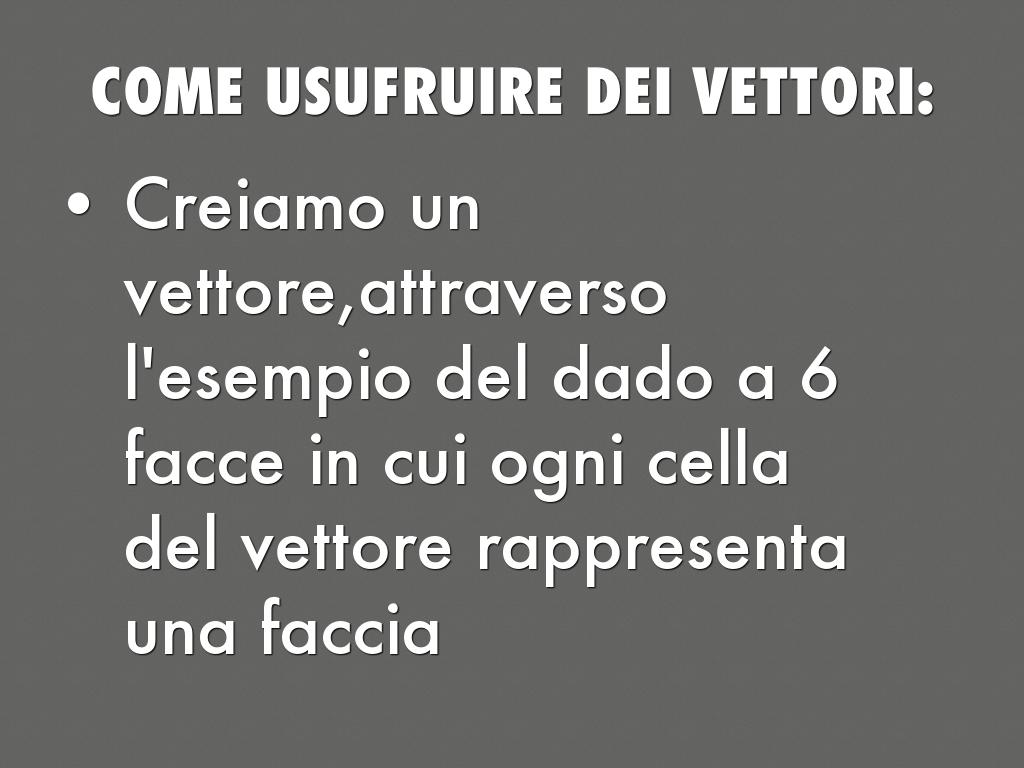 - Creiamo un vettore,attraverso l'esempio del dado a 6 facce in cui ogni cella del vettore rappresenta una faccia
