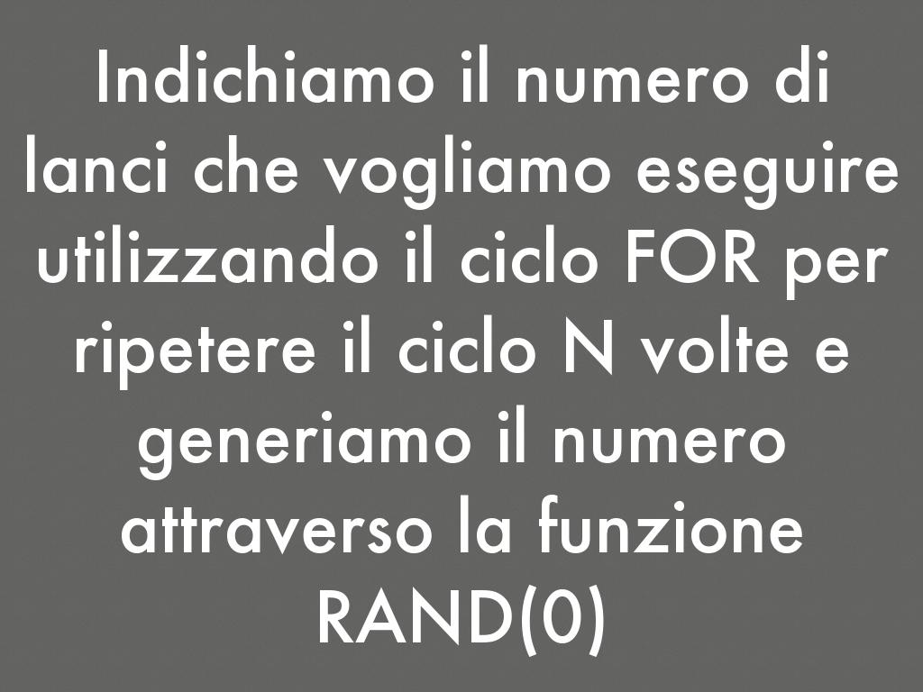 Indichiamo il numero di lanci che vogliamo eseguire utilizzando il ciclo FOR per ripetere il ciclo N volte e generiamo il numero attraverso la funzione RAND(0)