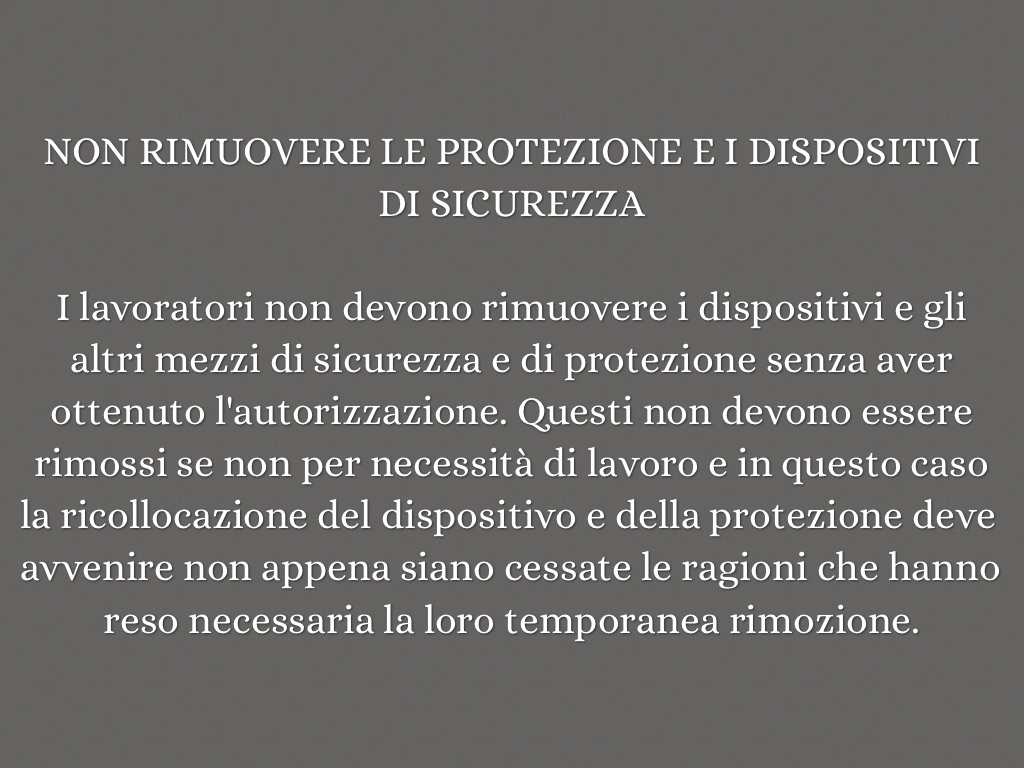 I lavoratori non devono rimuovere i dispositivi e gli altri mezzi di sicurezza e di protezione senza aver ottenuto l'autorizzazione. Questi non devono essere rimossi se non per necessità di lavoro e in questo caso la ricollocazione del dispositivo e della protezione deve avvenire non appena siano cessate le ragioni che hanno reso necessaria la loro temporanea rimozione.