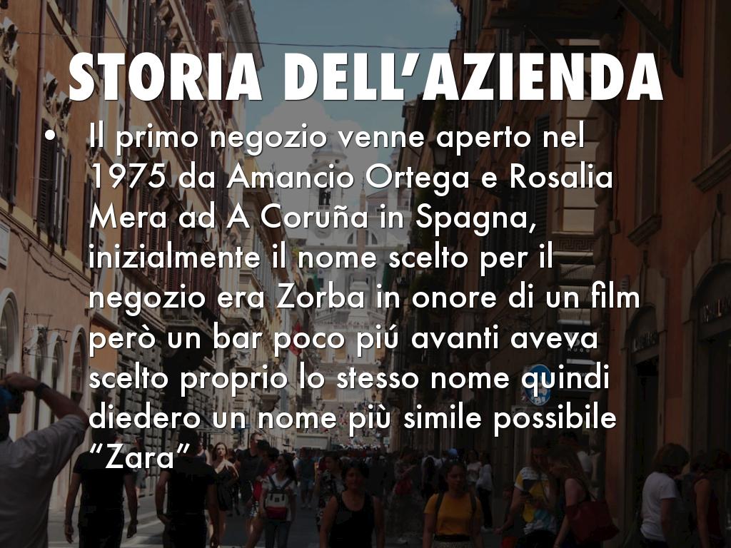 Il primo negozio venne aperto nel 1975 da Amancio Ortega e Rosalia Mera ad A Coruña in Spagna, inizialmente il nome scelto per il negozio era Zorba in onore di un film però un bar poco piú avanti aveva scelto proprio lo stesso nome quindi diedero un nome più simile possibile “Zara”