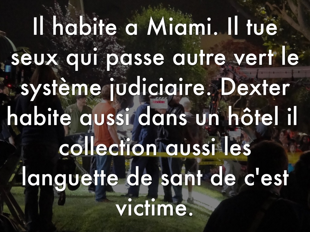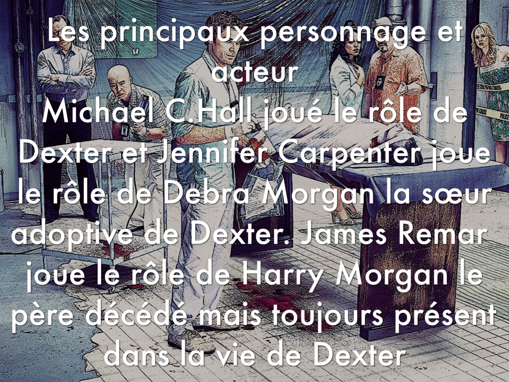 Michael C.Hall joué le rôle de Dexter et Jennifer Carpenter joue le rôle de Debra Morgan la sœur adoptive de Dexter. James Remar joue le rôle de Harry Morgan le père décédé mais toujours présent dans la vie de Dexter