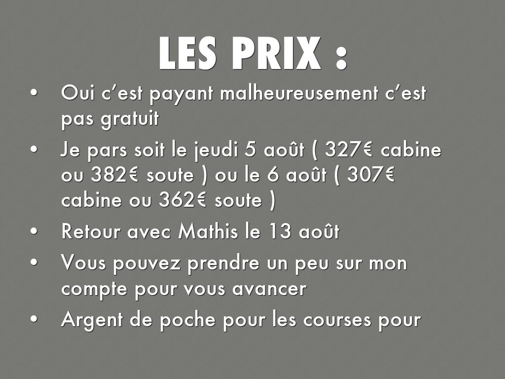 Je pars soit le jeudi 5 août ( 327€ cabine ou 382€ soute ) ou le 6 août ( 307€ cabine ou 362€ soute )