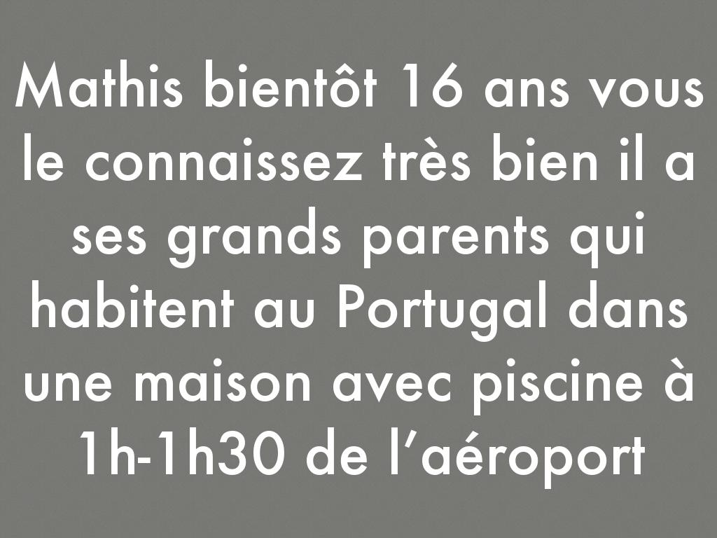 Mathis bientôt 16 ans vous le connaissez très bien il a ses grands parents qui habitent au Portugal dans une maison avec piscine à 1h-1h30 de l’aéroport