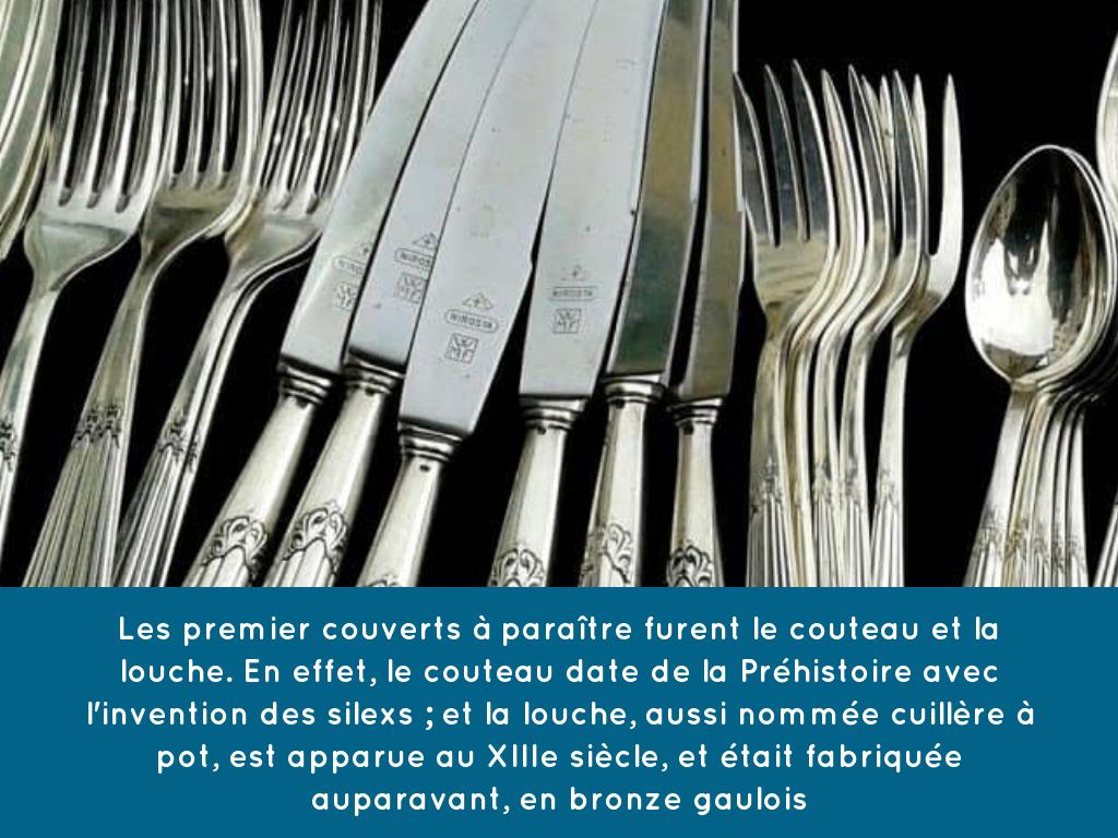 Les premier couverts à paraître furent le couteau et la louche. En effet, le couteau date de la Préhistoire avec l'invention des silexs ; et la louche, aussi nommée cuillère à pot, est apparue au XIIIe siècle, et était fabriquée auparavant, en bronze gaulois