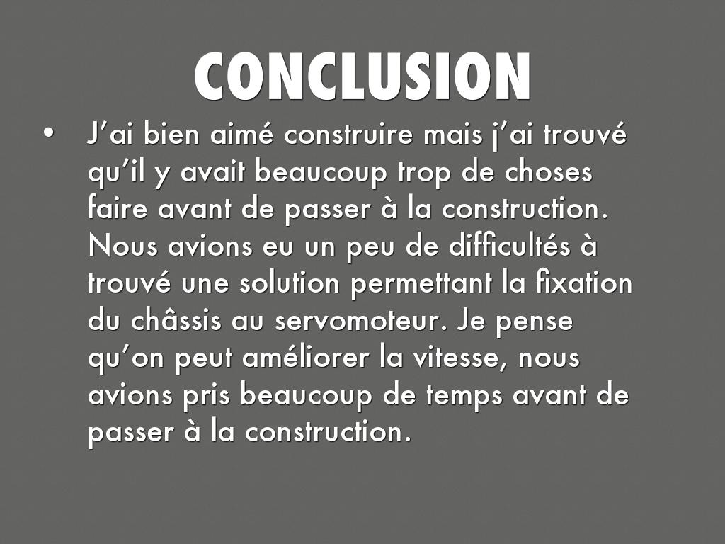 - J’ai bien aimé construire mais j’ai trouvé qu’il y avait beaucoup trop de choses faire avant de passer à la construction. Nous avions eu un peu de difficultés à trouvé une solution permettant la fixation du châssis au servomoteur. Je pense qu’on peut améliorer la vitesse, nous avions pris beaucoup de temps avant de passer à la construction.