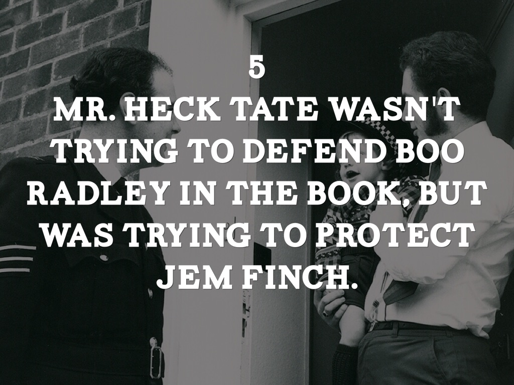 Mr. Heck Tate wasn't trying to defend boo Radley in the book, but was trying to protect Jem finch.