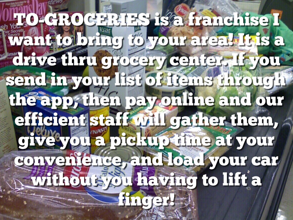 TO-GROCERIES is a franchise I want to bring to your area! It is a drive thru grocery center. If you send in your list of items through the app, then pay online and our efficient staff will gather them, give you a pickup time at your convenience, and load your car without you having to lift a finger!