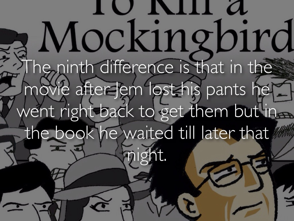 The ninth difference is that in the movie after Jem lost his pants he went right back to get them but in the book he waited till later that night.