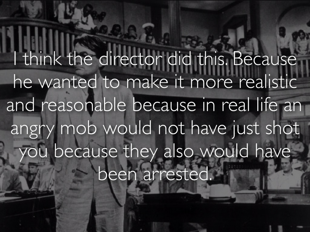 The final difference is that in the book Tom Robinson was trying to escape from a mob and was shot 17 times but in the movie he tried to escape from the prison guards.