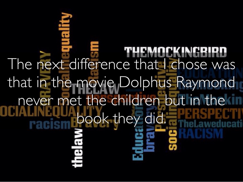 The next difference that I chose was that in the movie Dolphus Raymond never met the children but in the book they did.
