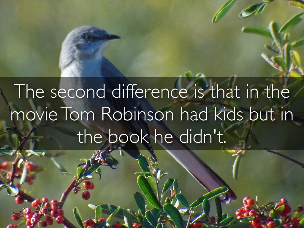 The second difference is that in the movie Tom Robinson had kids but in the book he didn't.