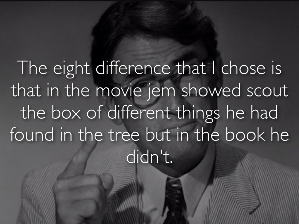 The eight difference that I chose is that in the movie jem showed scout the box of different things he had found in the tree but in the book he didn't.