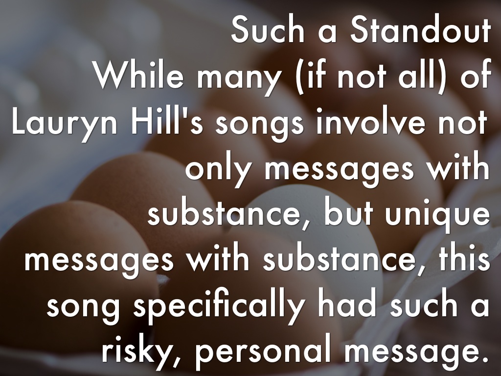 Such a Standout While many (if not all) of Lauryn Hill's songs involve not only messages with substance, but unique messages with substance, this song specifically had such a risky, personal message.
