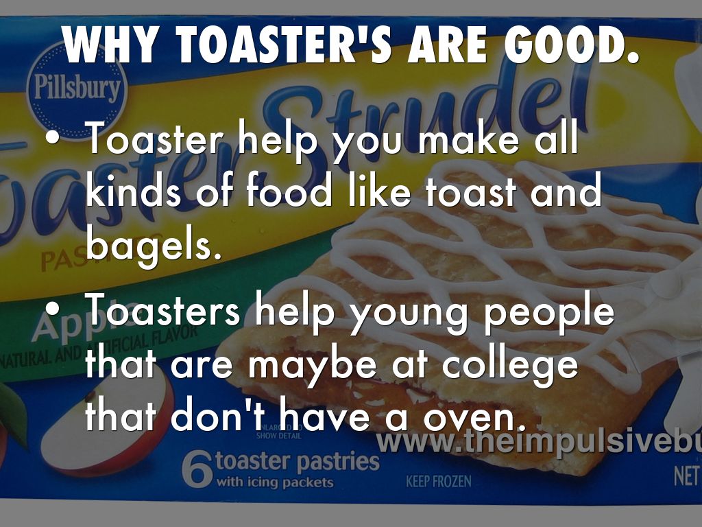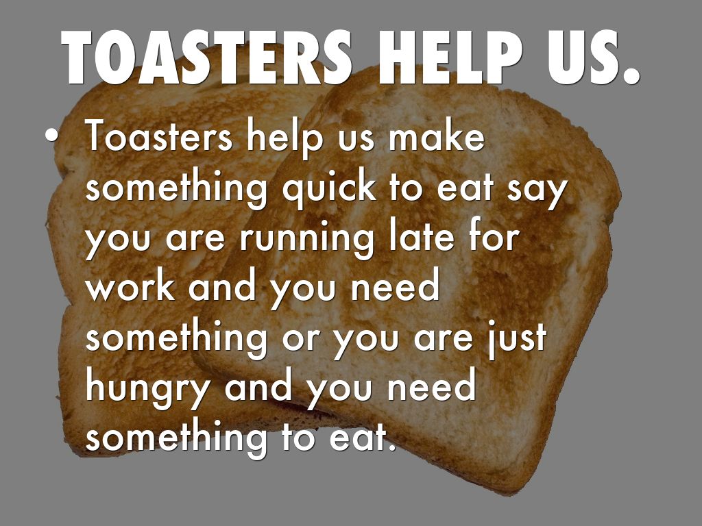 Toasters help us make something quick to eat say you are running late for work and you need something or you are just hungry and you need something to eat.