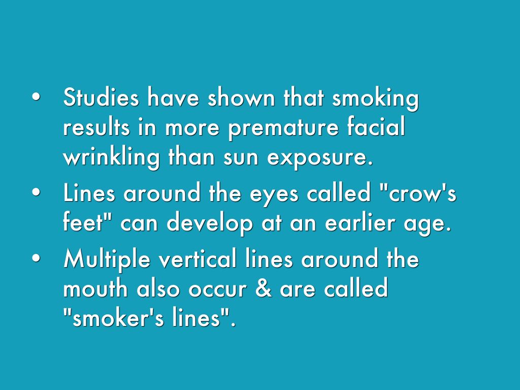Studies have shown that smoking results in more premature facial wrinkling than sun exposure.