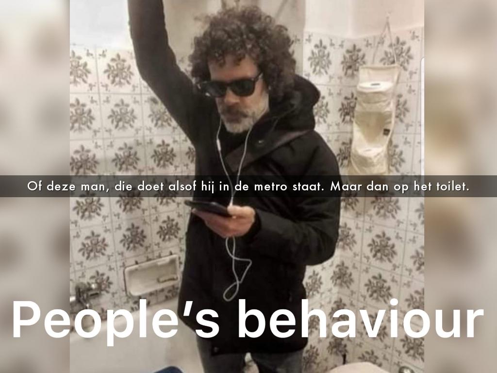 Of deze man, die doet alsof hij in de metro staat. Maar dan op het toilet.