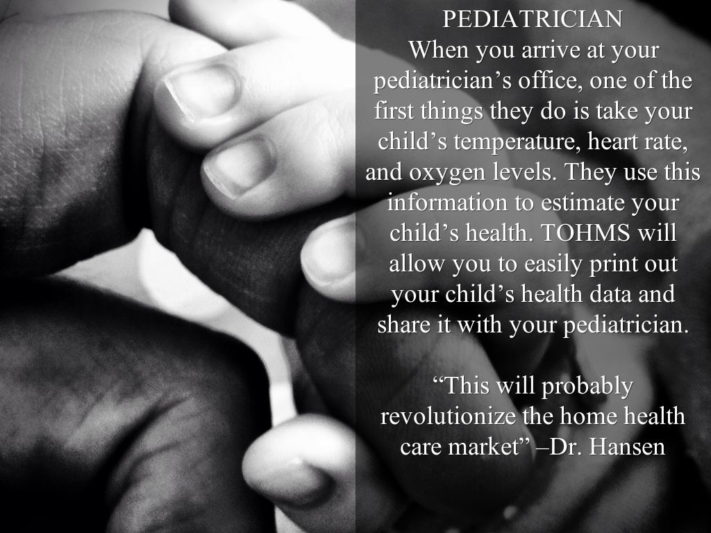 When you arrive at your pediatrician’s office, one of the first things they do is take your child’s temperature, heart rate, and oxygen levels. They use this information to estimate your child’s health. TOHMS will allow you to easily print out your child’s health data and share it with your pediatrician.