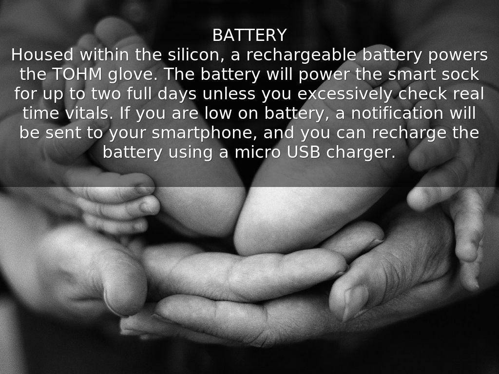 Housed within the silicon, a rechargeable battery powers the TOHM glove. The battery will power the smart sock for up to two full days unless you excessively check real time vitals. If you are low on battery, a notification will be sent to your smartphone, and you can recharge the battery using a micro USB charger.
