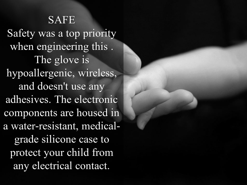 Safety was a top priority when engineering this . The glove is hypoallergenic, wireless, and doesn't use any adhesives. The electronic components are housed in a water-resistant, medical-grade silicone case to protect your child from any electrical contact.