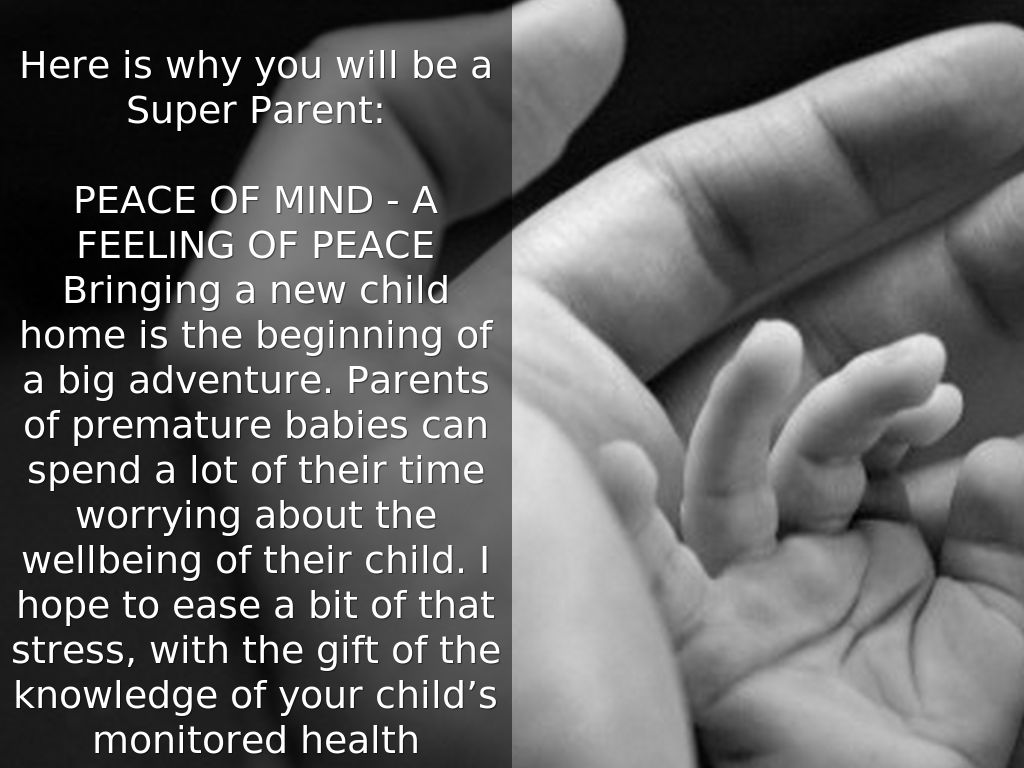 Bringing a new child home is the beginning of a big adventure. Parents of premature babies can spend a lot of their time worrying about the wellbeing of their child. I hope to ease a bit of that stress, with the gift of the knowledge of your child’s monitored health