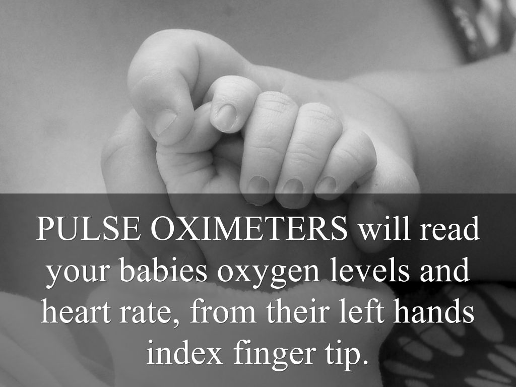 PULSE OXIMETERS will read your babies oxygen levels and heart rate, from their left hands index finger tip.