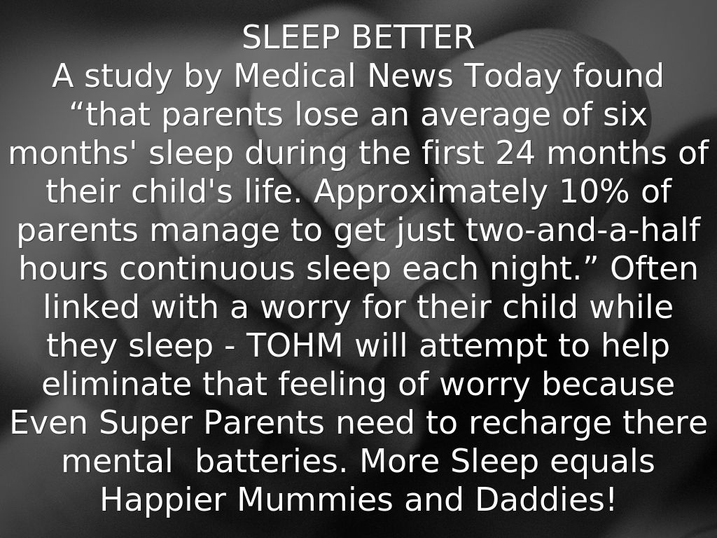 A study by Medical News Today found “that parents lose an average of six months' sleep during the first 24 months of their child's life. Approximately 10% of parents manage to get just two-and-a-half hours continuous sleep each night.” Often linked with a worry for their child while they sleep - TOHM will attempt to help eliminate that feeling of worry because Even Super Parents need to recharge there mental batteries. More Sleep equals Happier Mummies and Daddies!