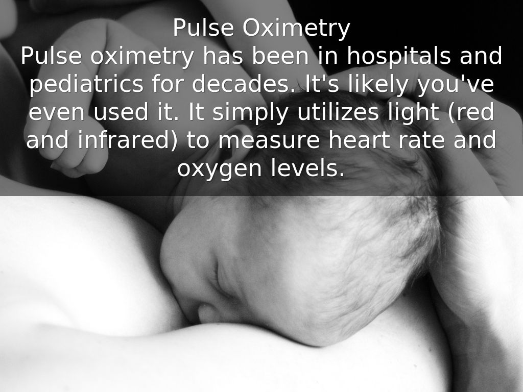 Pulse oximetry has been in hospitals and pediatrics for decades. It's likely you've even used it. It simply utilizes light (red and infrared) to measure heart rate and oxygen levels.