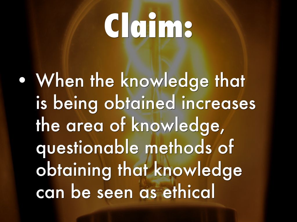 • When the knowledge that is being obtained increases the area of knowledge, questionable methods of obtaining that knowledge can be seen as ethical