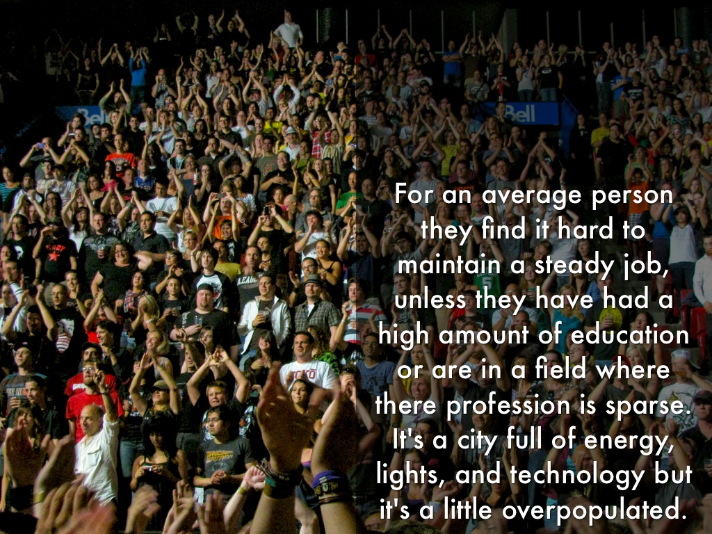 For an average person they find it hard to maintain a steady job, unless they have had a high amount of education or are in a field where there profession is sparse. It's a city full of energy, lights, and technology but it's a little overpopulated.