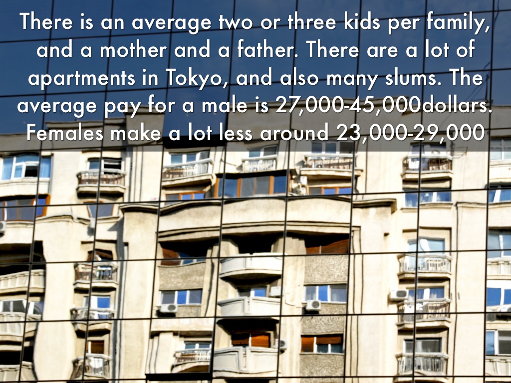 There is an average two or three kids per family, and a mother and a father. There are a lot of apartments in Tokyo, and also many slums. The average pay for a male is 27,000-45,000dollars. Females make a lot less around 23,000-29,000