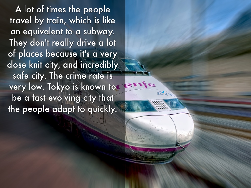 A lot of times the people travel by train, which is like an equivalent to a subway. They don't really drive a lot of places because it's a very close knit city, and incredibly safe city. The crime rate is very low. Tokyo is known to be a fast evolving city that the people adapt to quickly.