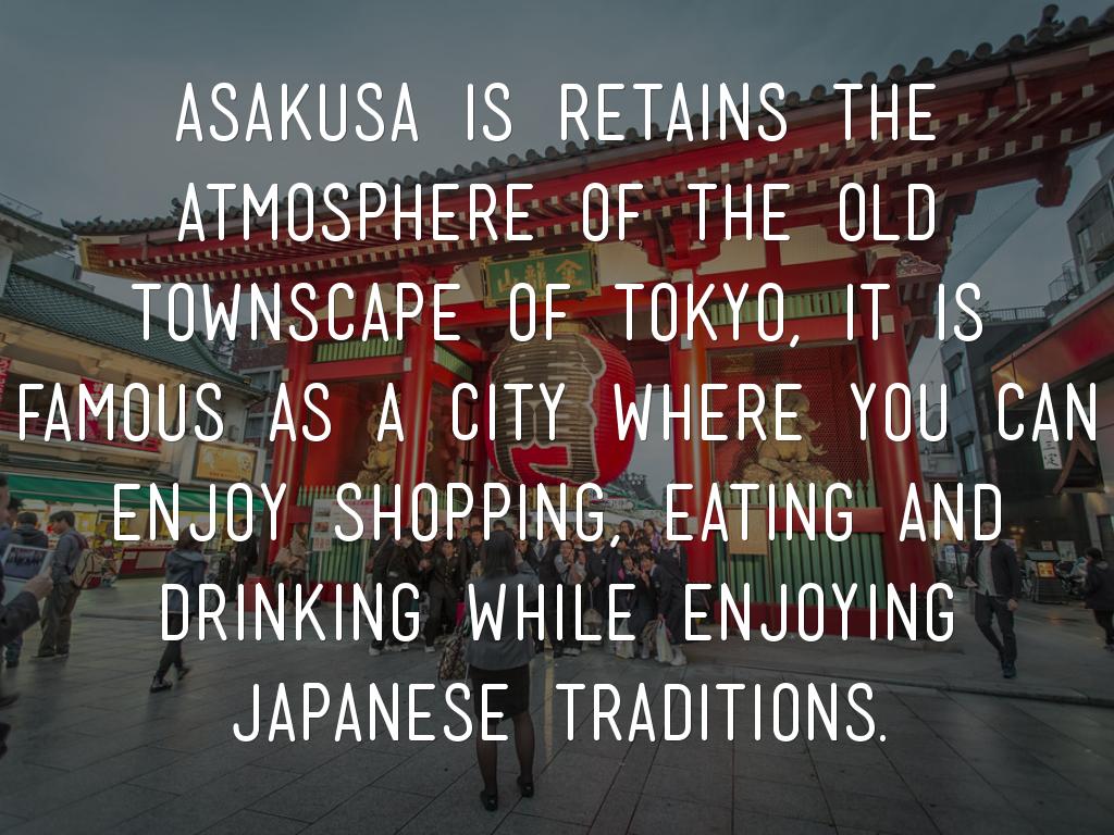 Asakusa is retains the atmosphere of the old townscape of Tokyo, It is famous as a city where you can enjoy shopping, eating and drinking while enjoying Japanese traditions.