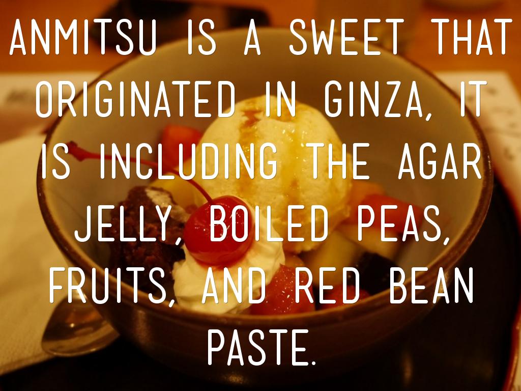 Anmitsu is a sweet that originated in Ginza, It is including the agar jelly, boiled peas, fruits, and red bean paste.