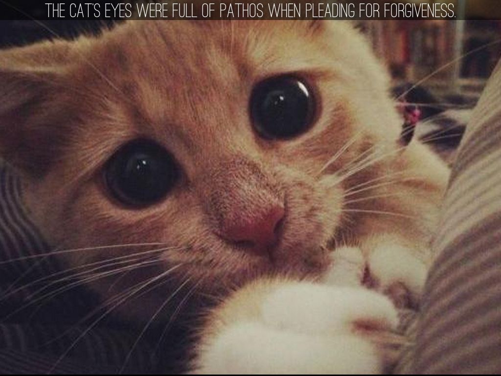 The cat's eyes were full of pathos when pleading for forgiveness.