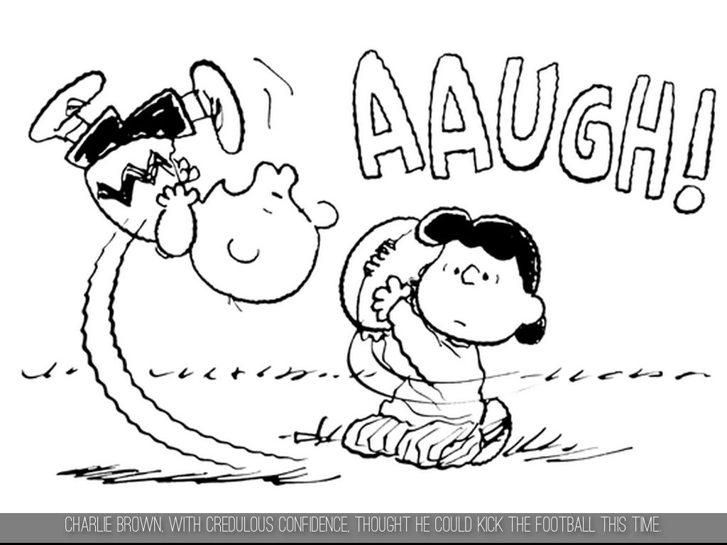 CHARLIE BROWN, WITH CREDULOUS CONFIDENCE, THOUGHT HE COULD KICK THE FOOTBALL THIS TIME.