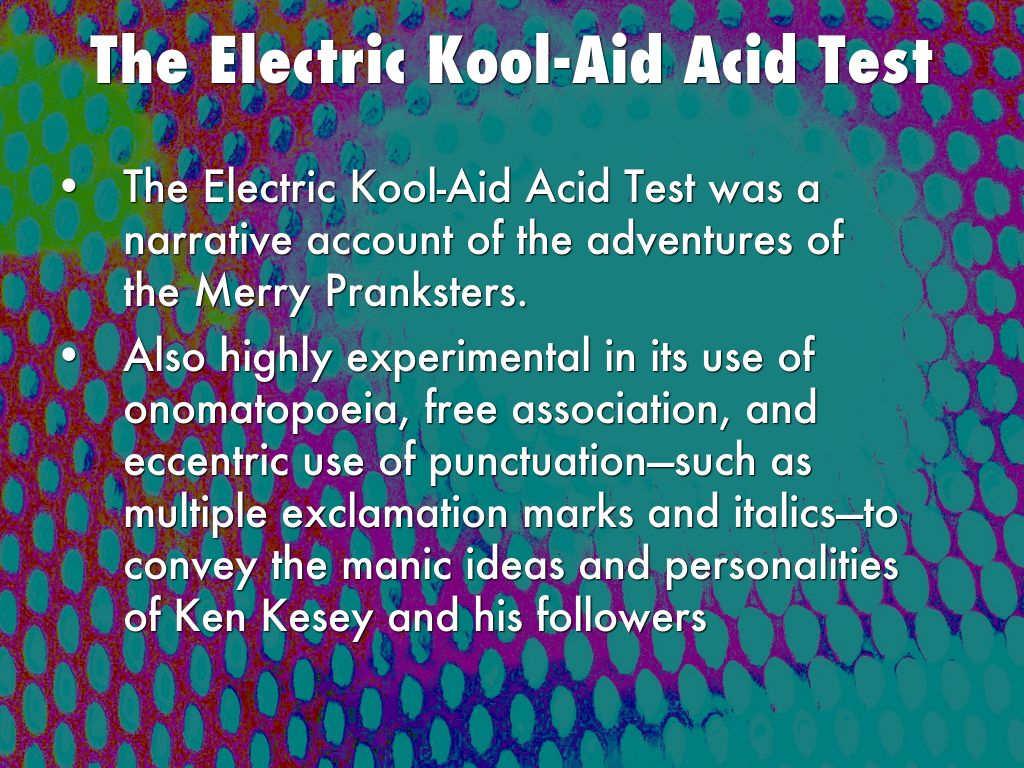 Also highly experimental in its use of onomatopoeia, free association, and eccentric use of punctuation—such as multiple exclamation marks and italics—to convey the manic ideas and personalities of Ken Kesey and his followers