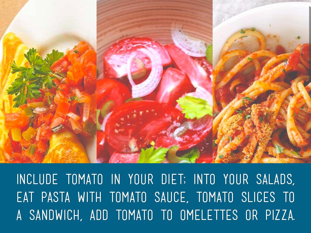 Include tomato in your diet; into your salads, eat pasta with tomato sauce, tomato slices to a sandwich, add tomato to omelettes or pizza.