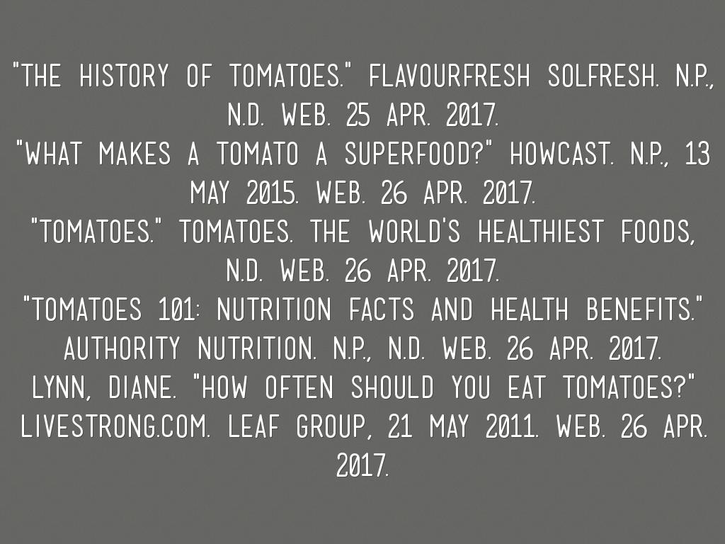 "What Makes a Tomato a Superfood?" Howcast. N.p., 13 May 2015. Web. 26 Apr. 2017.