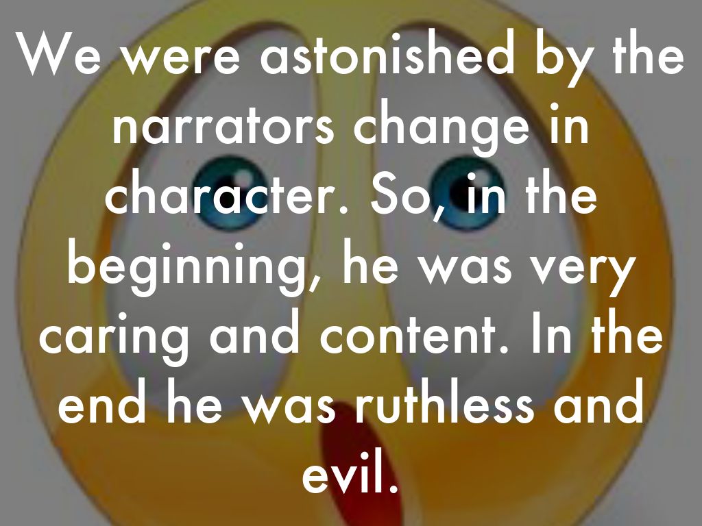 We were astonished by the narrators change in character. So, in the beginning, he was very caring and content. In the end he was ruthless and evil.