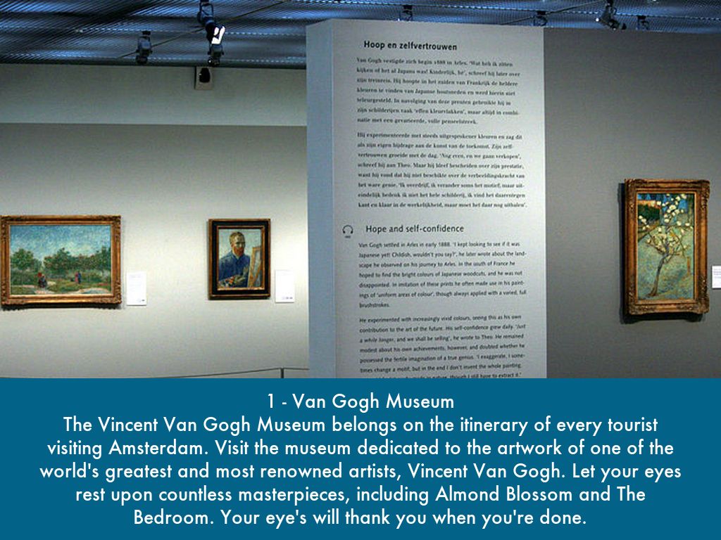 The Vincent Van Gogh Museum belongs on the itinerary of every tourist visiting Amsterdam. Visit the museum dedicated to the artwork of one of the world's greatest and most renowned artists, Vincent Van Gogh. Let your eyes rest upon countless masterpieces, including Almond Blossom and The Bedroom. Your eye's will thank you when you're done.
