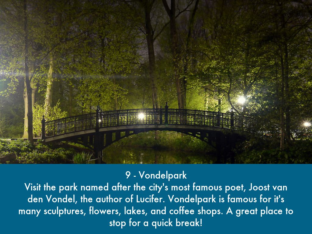 Visit the park named after the city's most famous poet, Joost van den Vondel, the author of Lucifer. Vondelpark is famous for it's many sculptures, flowers, lakes, and coffee shops. A great place to stop for a quick break!