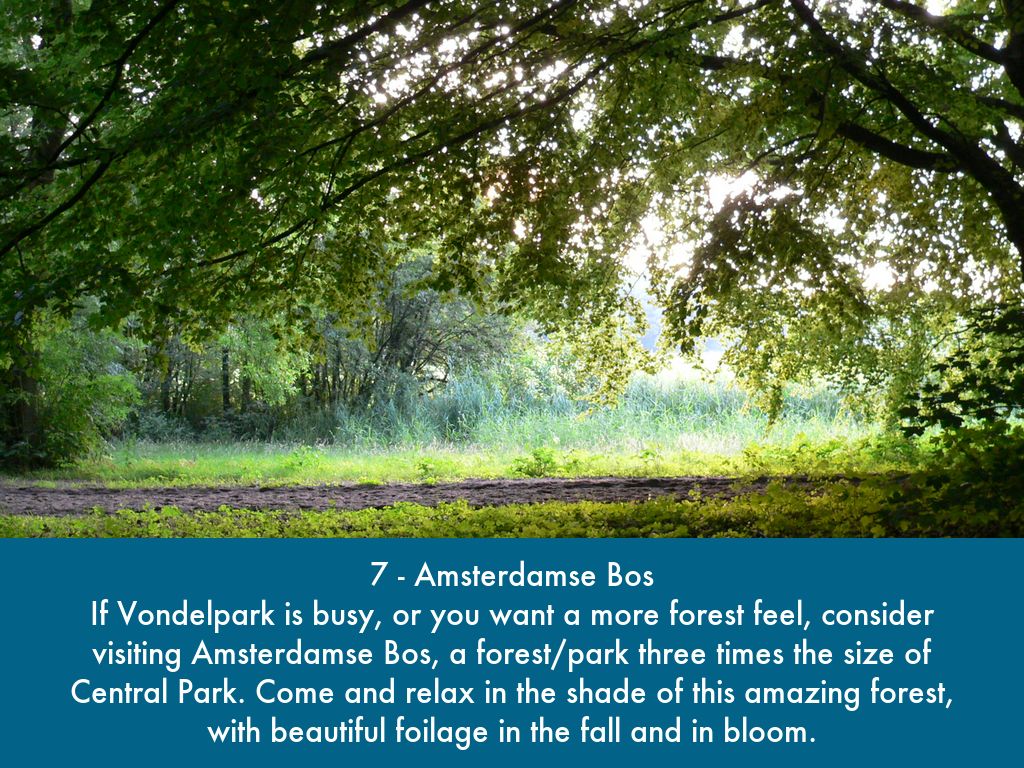 If Vondelpark is busy, or you want a more forest feel, consider visiting Amsterdamse Bos, a forest/park three times the size of Central Park. Come and relax in the shade of this amazing forest, with beautiful foilage in the fall and in bloom.